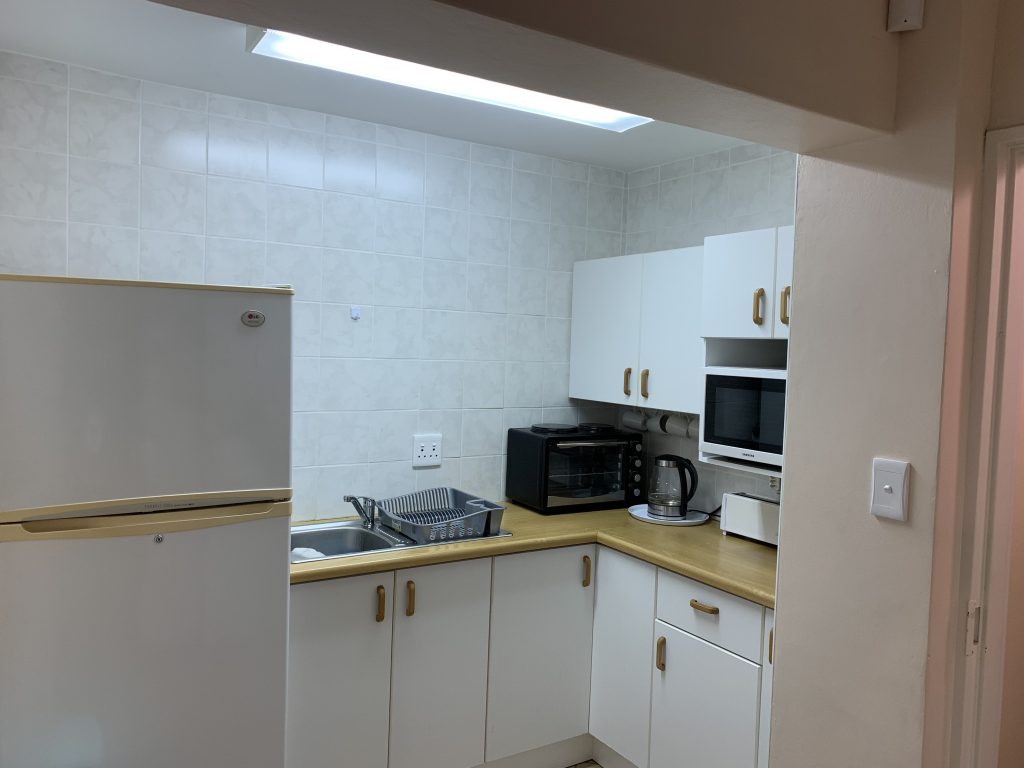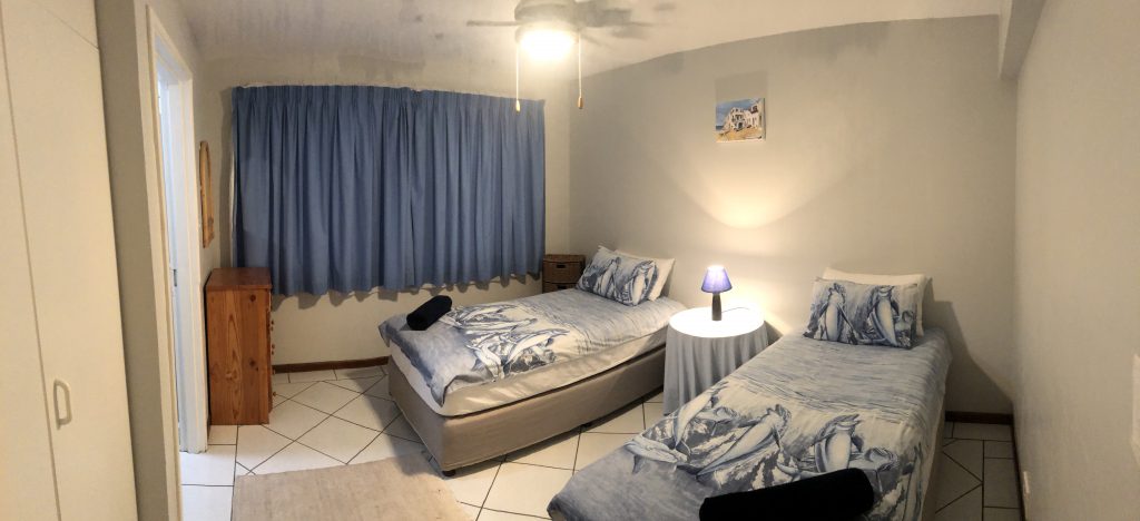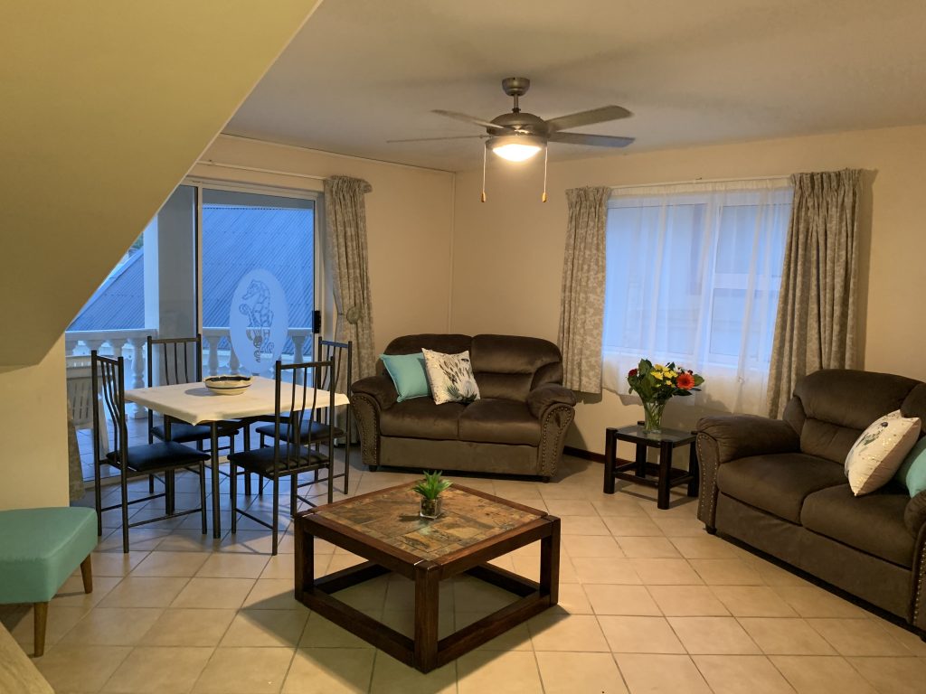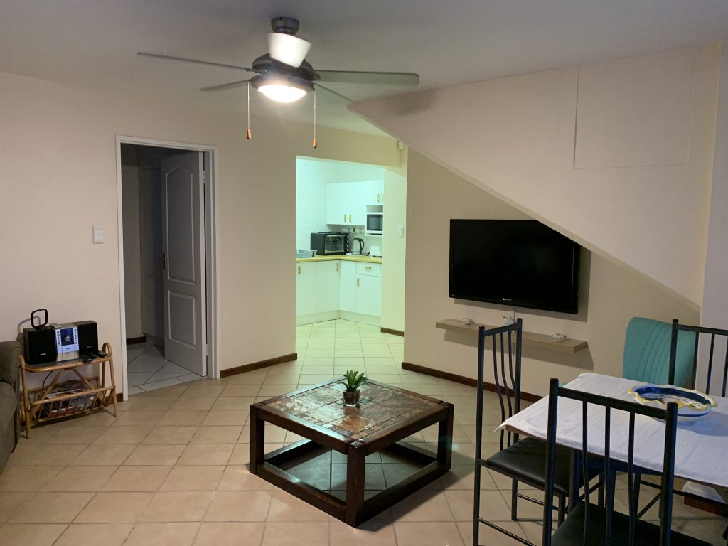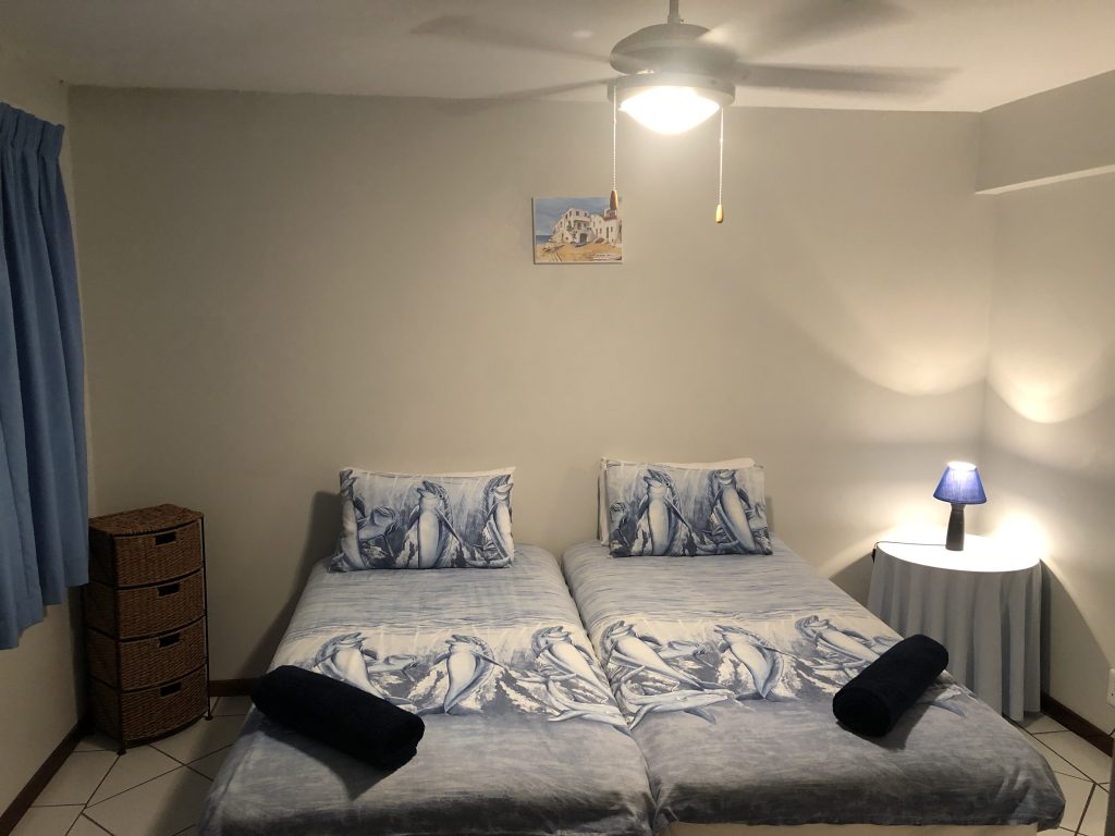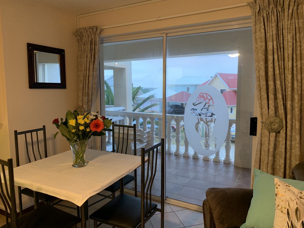 This unit has a kitchenette, with a full-size fridge, kettle, toaster and microwave. The open-plan lounge has a large TV and a dining room table which adjoins the outdoor patio with sea-view. Chairs, tables and braai facilities are available on the outdoor patio.
