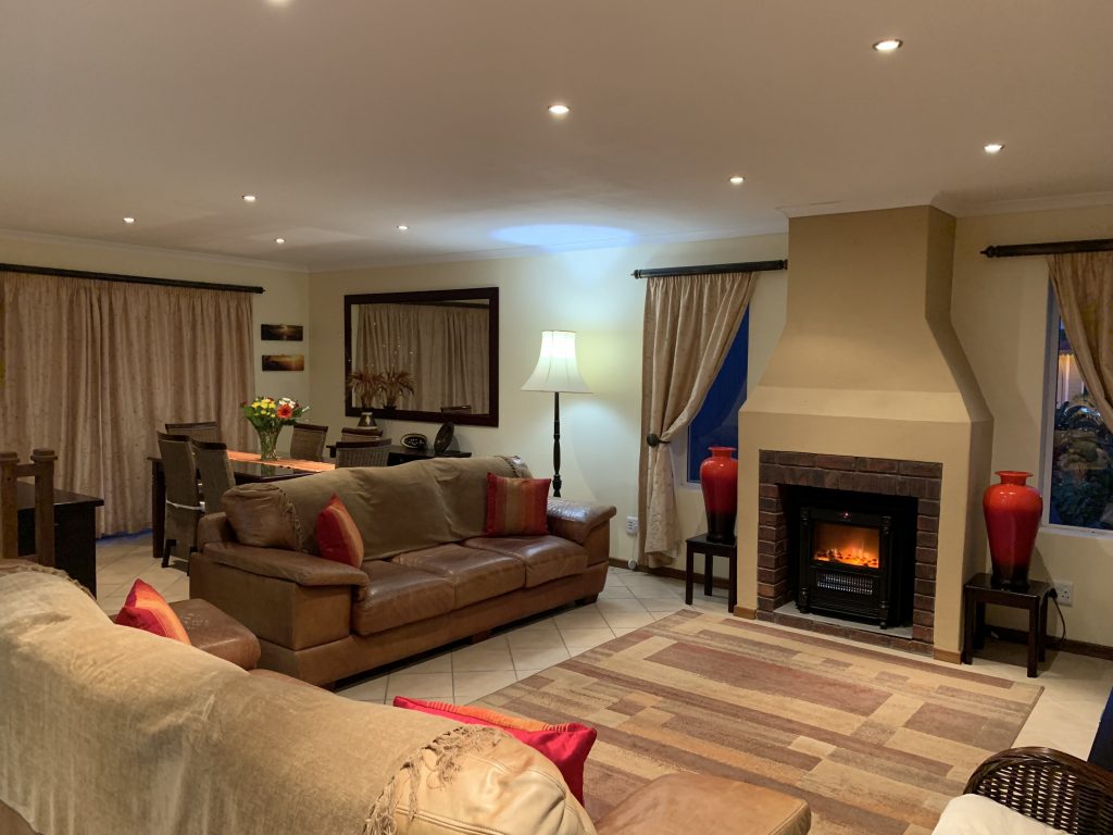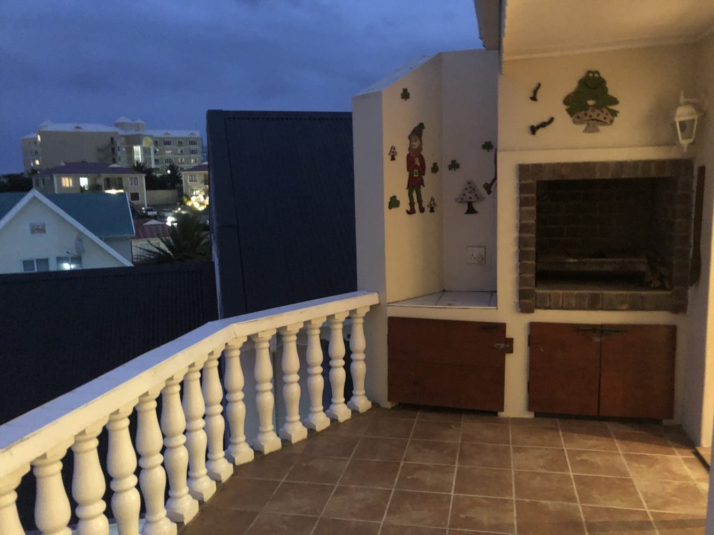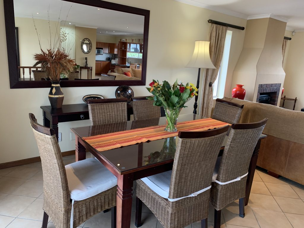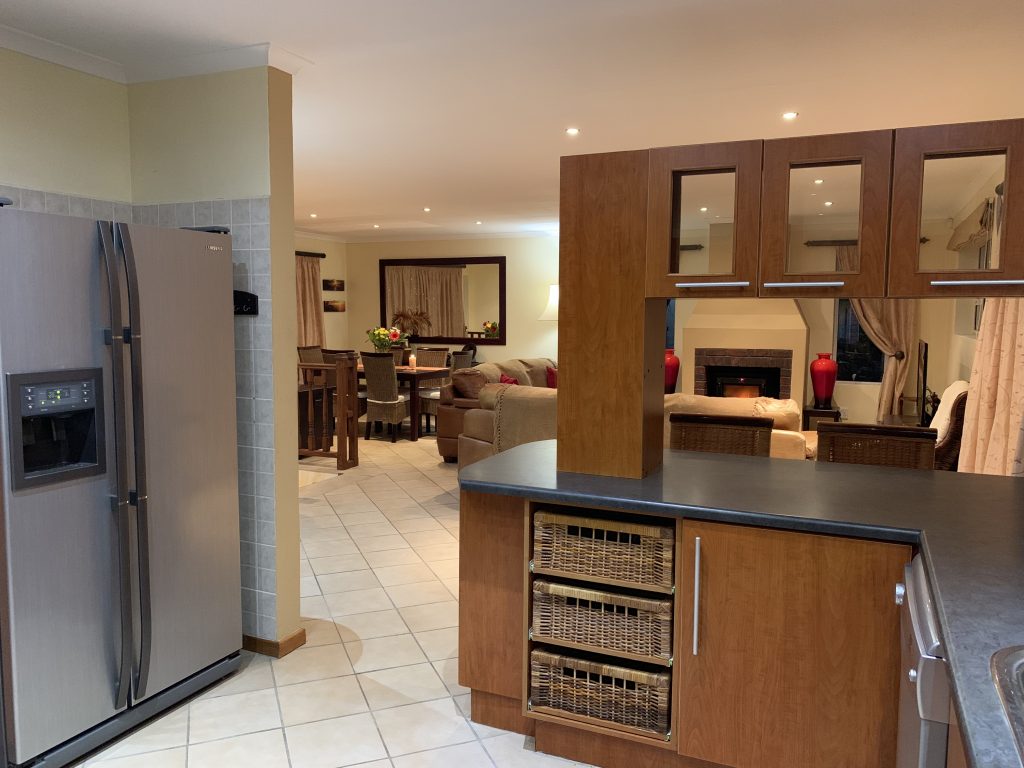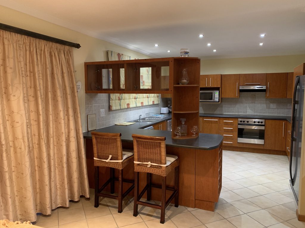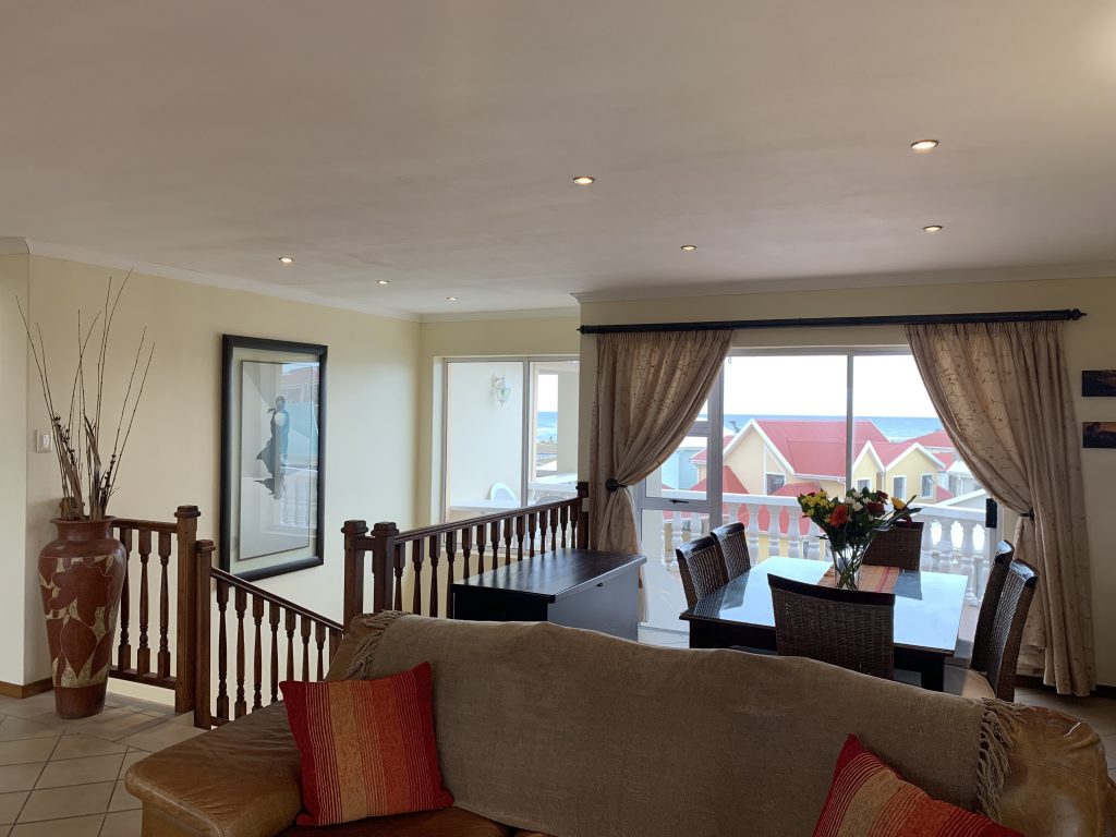The fully-equipped, spacious modern kitchen with dish washer and washing machine. The open-plan lounge has a large TV, and -for the cooler winter months- a built in electric fire place. The large dining room table adjoins the open-air outdoor patio also with a sea-view and has a built-in braai facility.