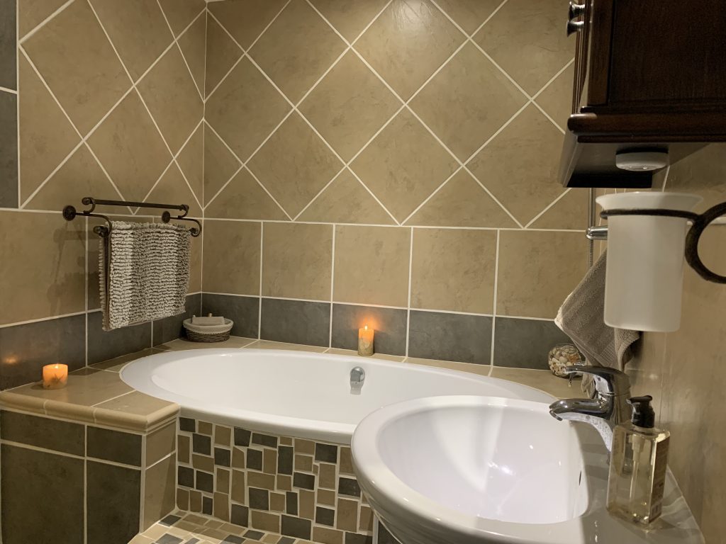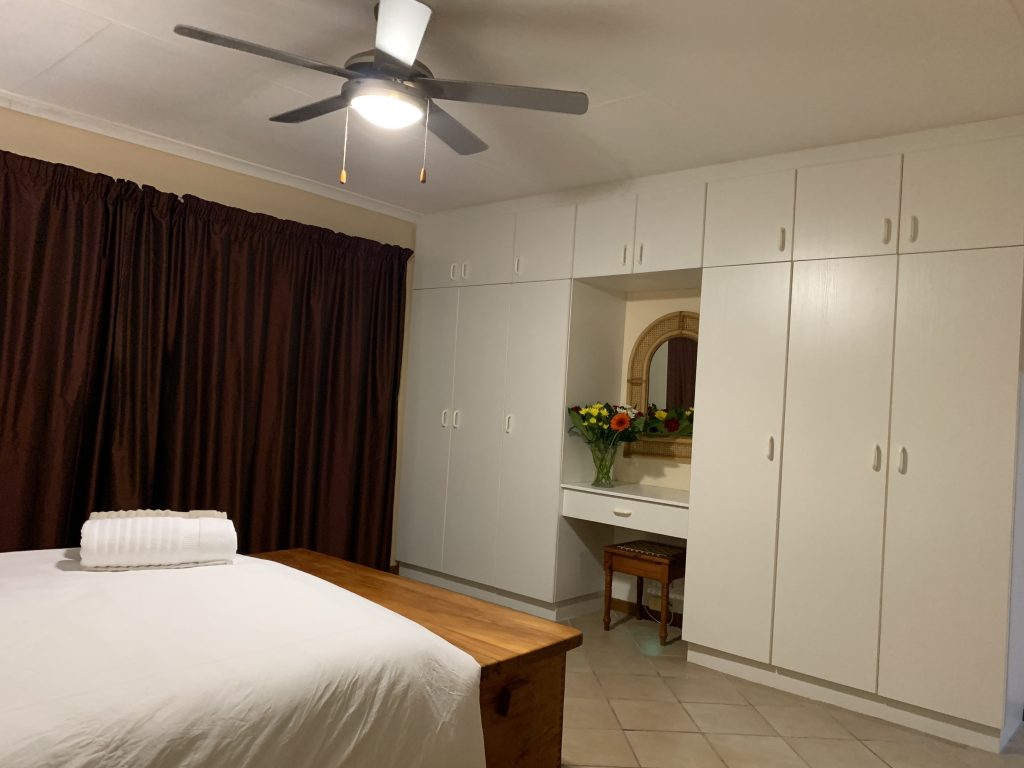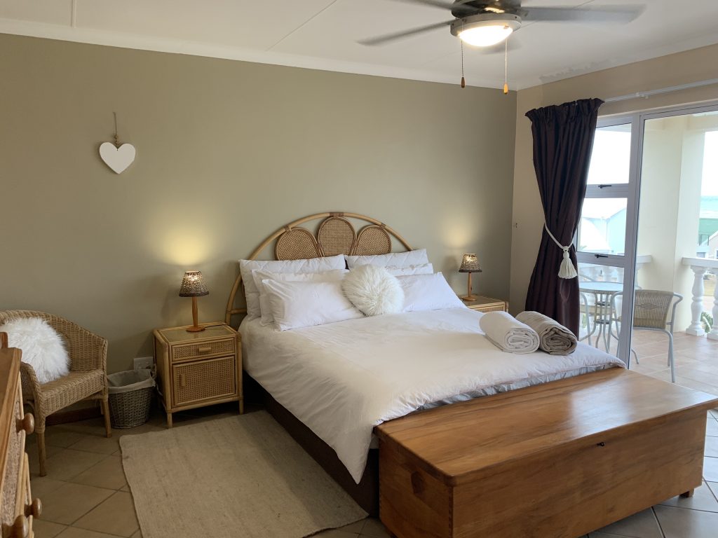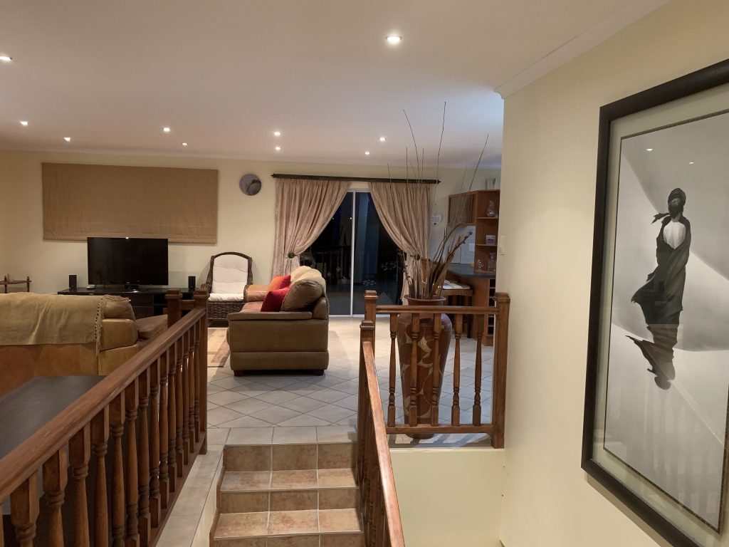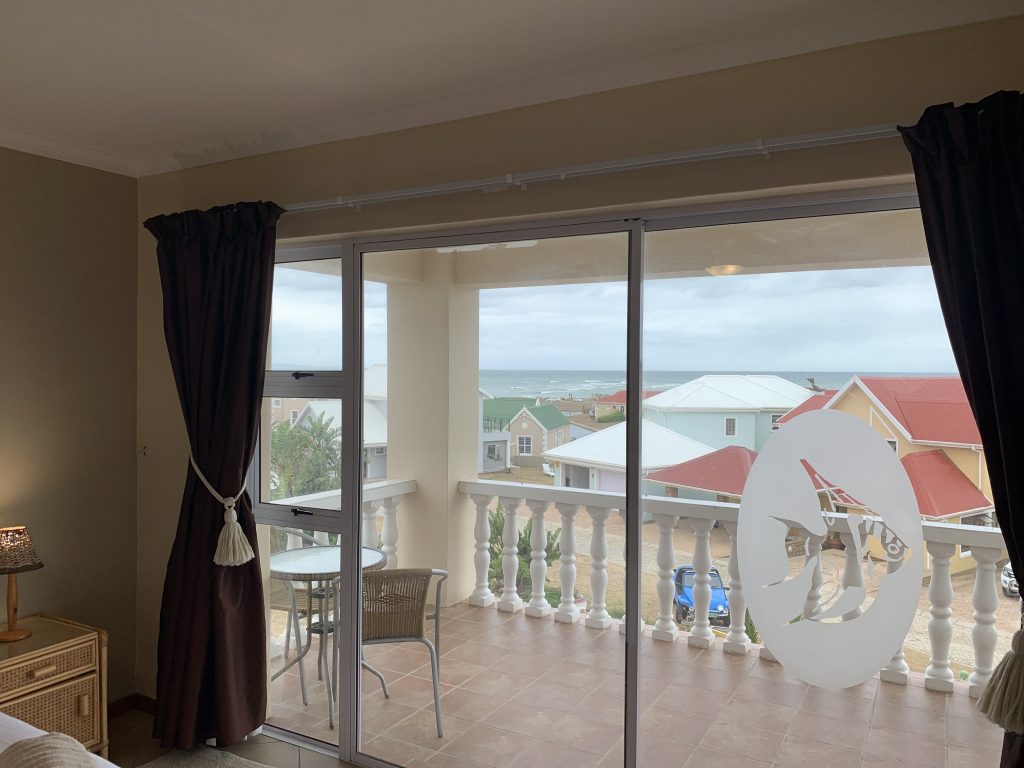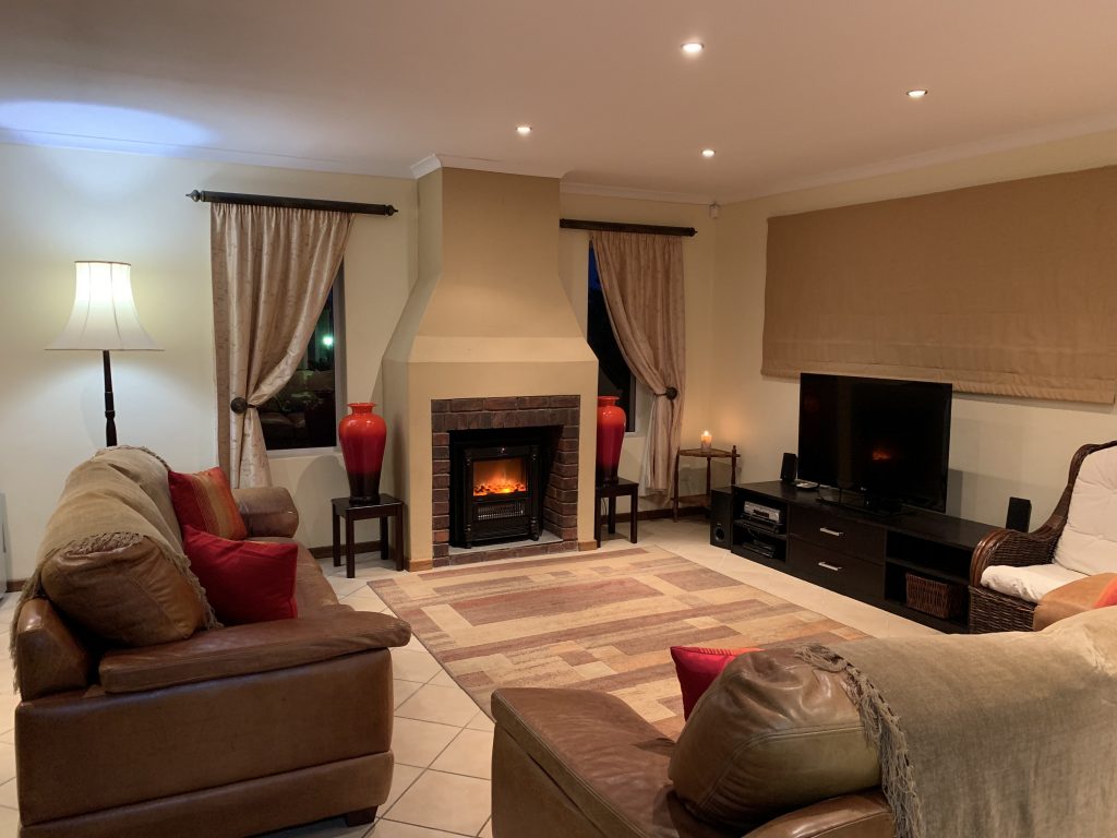 The fully-equipped, spacious modern kitchen with dish washer and washing machine. The open-plan lounge has a large TV, and -for the cooler winter months- a built in electric fire place. The large dining room table adjoins the open-air outdoor patio also with a sea-view and has a built-in braai facility.